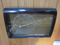 扉の全面がガラスで覆われたデザインで、そのガラスが曲げ硝子になっているのが特徴です。 文字板はアルミ板に器用に木目調にペイントしてあります。木目は印刷ではなく刷毛塗りっぽいところが時代を感じます。 長短針は金色のメッキ、秒針は背景が茶色なので白をベースに先端だけ赤く塗ってあります。