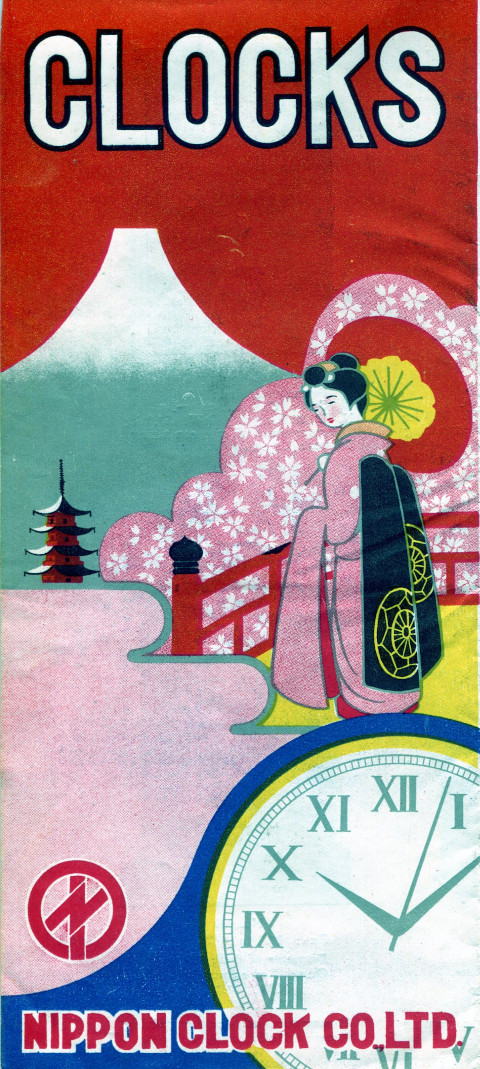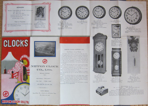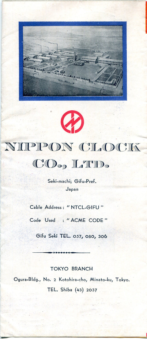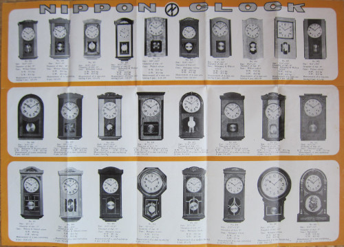日本時計の輸出用クロックカタログ。 両面印刷の一枚ものですが、鮮やかな表紙がとても魅力的で、会社概要もあって充実した内容です。 製品は数字の品番で管理されていますが、基本的に文字板のサイズで分類していたように感じ取れます。 日本時計の特徴である中三針機械の製品は、 丸型のグレシャムとトーマスの一部に "with sweep second hand" としてラインナップが3モデルのみであることから、 このカタログが製作されたのは昭和20年代後半と考えられます。