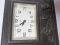 機械は八日巻きビーで、文字板は正角ではなく横長で白色、ガラスは面取りガラスです。 右側にラッパを吹く子供の天使、文字板の下方には三羽のウサギがいます。 ウサギは中央は正面を向き、左右は向き合っています。 話し合いをしているようにも、真ん中が行司役で相撲をとっているか踊りを踊っているようにも見えます。