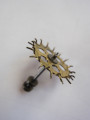 脱進機の構造を簡単に説明します。 アンクル式ではなく、ガンギの歯先が二段になっていて(写真8)直接ガンギ歯の先が天府のインパクトピンを蹴って天府へ力を伝えます。 細めの天真には切り込みがあります。 ガンギ車には長短それぞれ15の歯があって、短い歯は一段上に折り曲げられ、長い歯はケン先の役割をして天真に接してガンギ車の急な回転を防止しています。