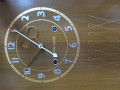 扉の全面がガラスで覆われたデザインで、そのガラスが曲げ硝子になっているのが特徴です。 文字板はアルミ板に器用に木目調にペイントしてあります。木目は印刷ではなく刷毛塗りっぽいところが時代を感じます。 長短針は金色のメッキ、秒針は背景が茶色なので白をベースに先端だけ赤く塗ってあります。