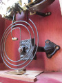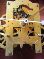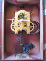 いくら扉の開け閉めを工夫しても振り子が前から操作できない時計はやっぱり扱いにくいものです。 特にこの時計の場合は渦鈴の裏側に振子を取り付ける必要があるため、振子を振り竿に引っ掛けにくいのなんの。 加えて渦鈴の固定台の形状と位置がふり幅ギリギリなため、 専用の小さめの振子を使わない限りふり幅が確保できずに振子が鈴台に激突します。 なんだかな〜、でこの時計あまり売れなかったんじゃないでしょうか。 ・・・振子の写真を撮るのを忘れました。汗